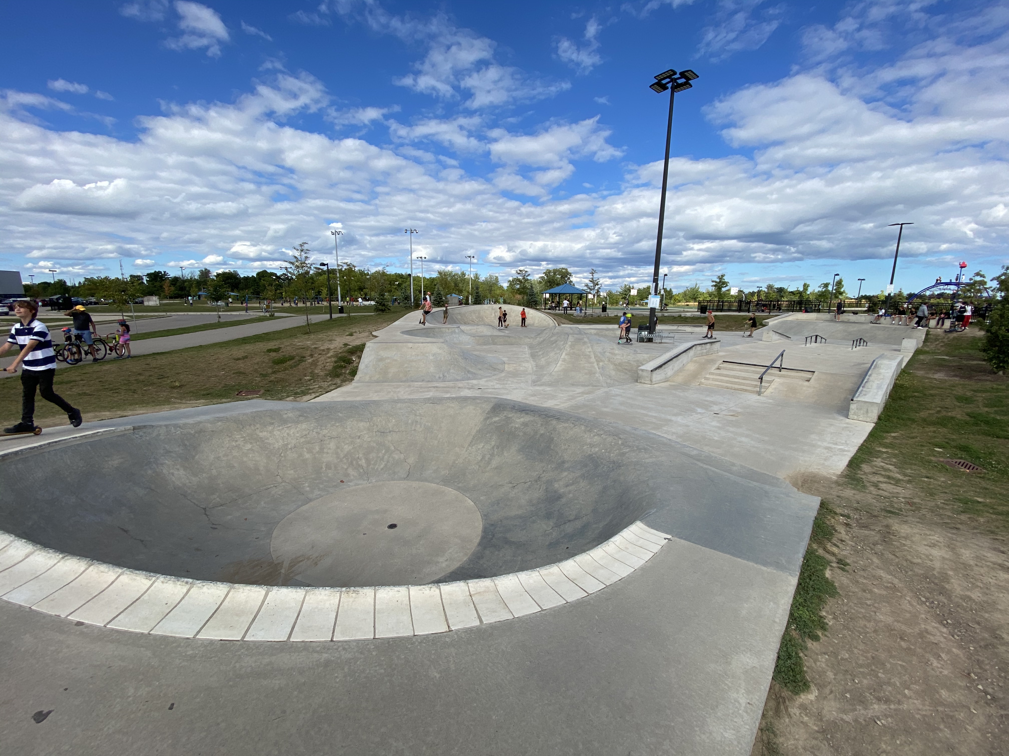Milton community skatepark within the Milton Sports Centre has a bunch of banks and bumps, rails, ledges, curved quarter pipes with pool coping and more. It also has a big bowl at the back. Being the newer of two parks in Milton it can get a bit busy – but it does have lights at night. Try the older skatepark in Lions Sports Park down the road if this one is too busy.