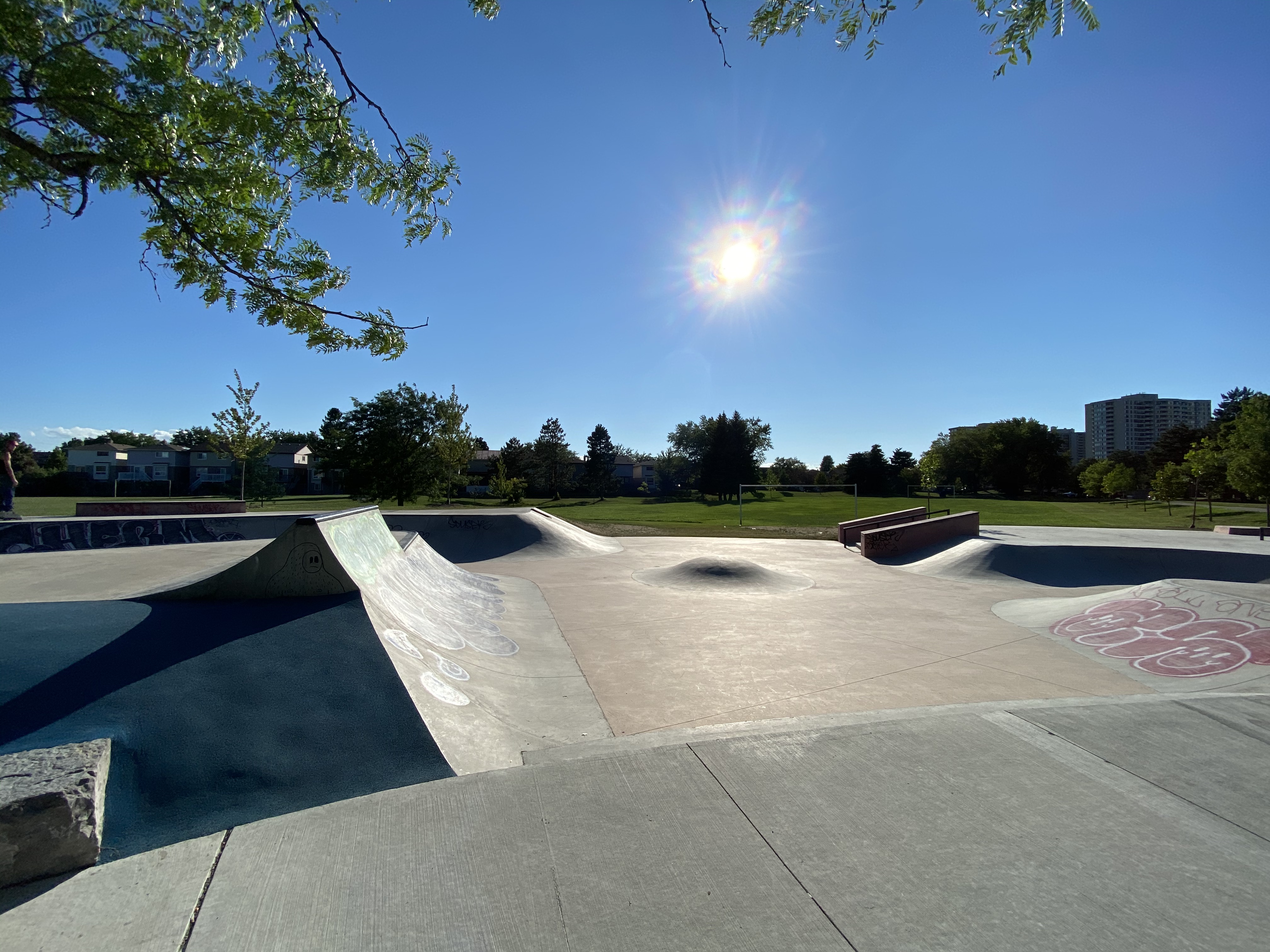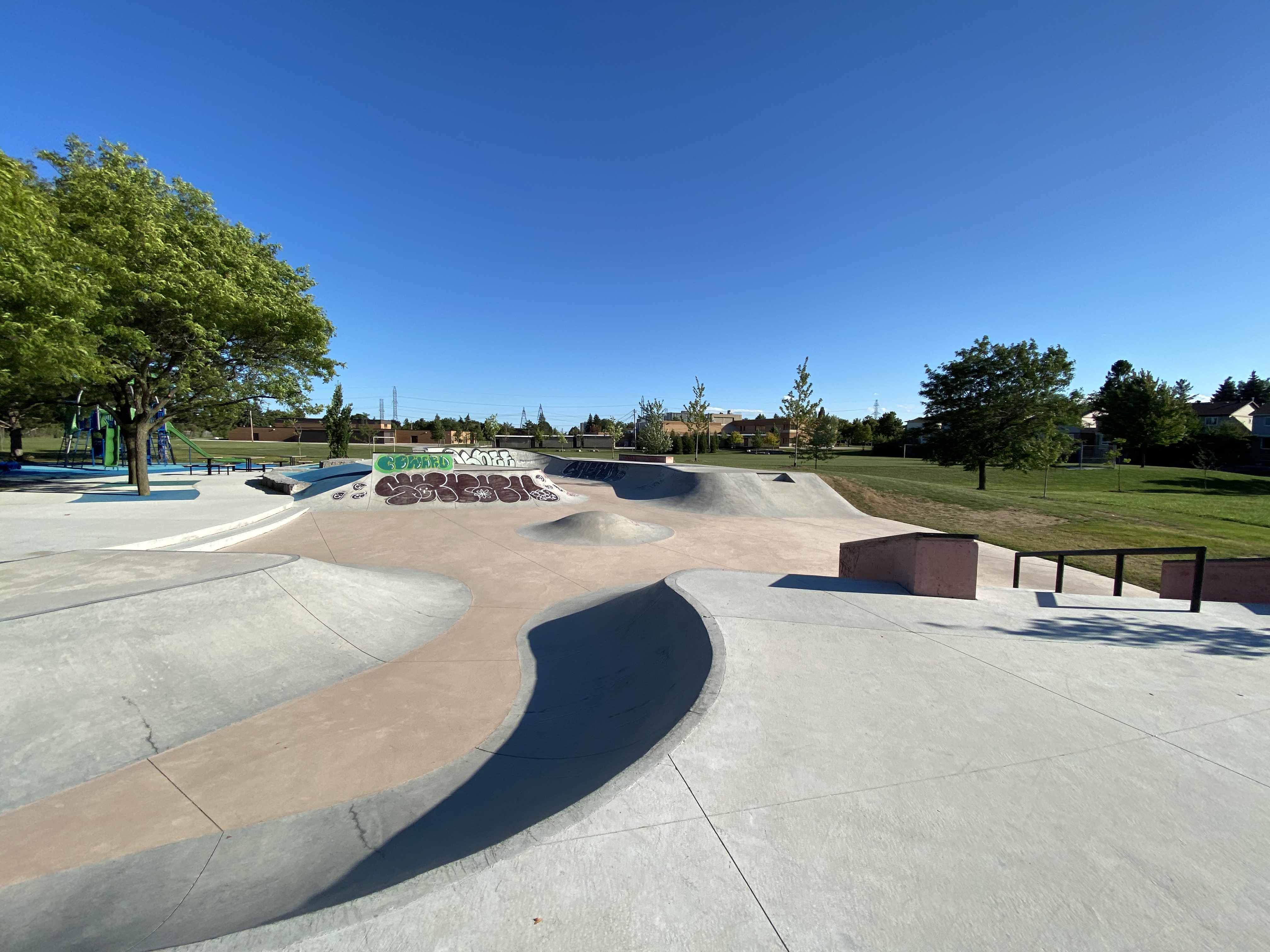 This small but fun skatepark popped up in a suburban neighbourhood north of Toronto. It has a small wavy channel, a bowl section, and a bunch of ledges and rails.